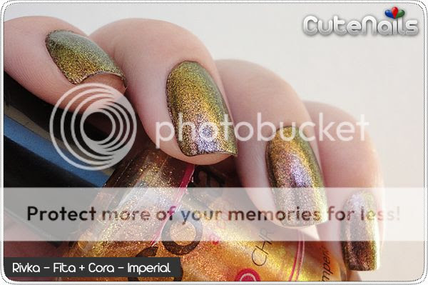 Antes de comentar sobre os esmaltes em si, quero compartilhar minha lógica: o Warm and Fozzie tem vários brilhinhos e neste ponto o Imperial da Cora também tem (de uma forma diferente, mas as partículas dele piscam bastante hehe). Neste momento pensei 'se eu usar um esmalte base que não seja cremoso, as chances de potencializar os brilhos aumentam' e foi o que eu fiz, escolhi o Fita da Rivka.